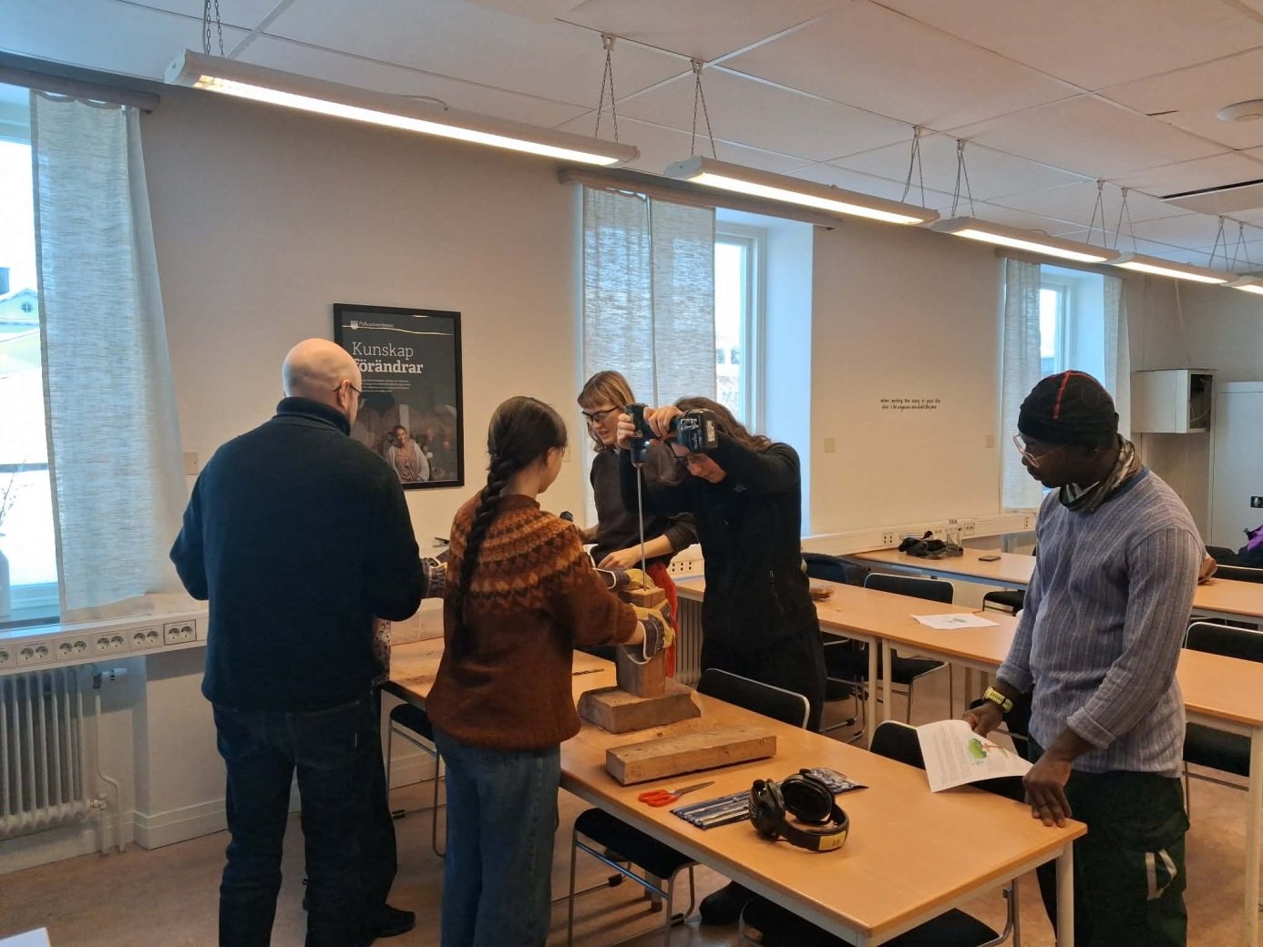 Med träblock, borrmaskiner och skyddshandskar började deltagarna skapa boplatser för solitärbin och andra nyttiga insekter. Arbetet blev snabbt både koncentrerat och socialt — några mätte och höll trästycken på plats, andra borrade hål, och flera hjälptes åt att planera hur insektshotellen skulle sättas ihop.