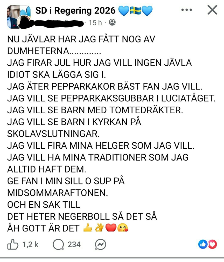Bilden ovan är vid en första anblick nästan underhållande. Det rör sig om en välbekant typ av utbrott i sociala medier, skrivet med versaler, fullt av svordomar och indignation, och genomsyrat av en känsla av kulturell kvävning och personlig oförrätt. Den som tillbringar ens en begränsad tid på nätet har sett otaliga varianter av samma uttryck. Tonen är barnsligt trotsig, kraven märkligt specifika, och upprördheten framstår samtidigt som överdriven och banal.